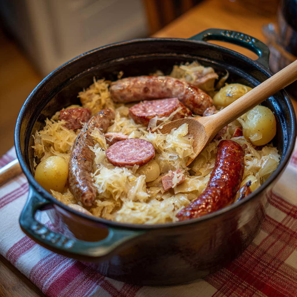 Choux, saucisse fumée, saucisse de Francfort, saucisse de Morteau, saucisson à l’ail, lard fumé, morceau de jambonneau.